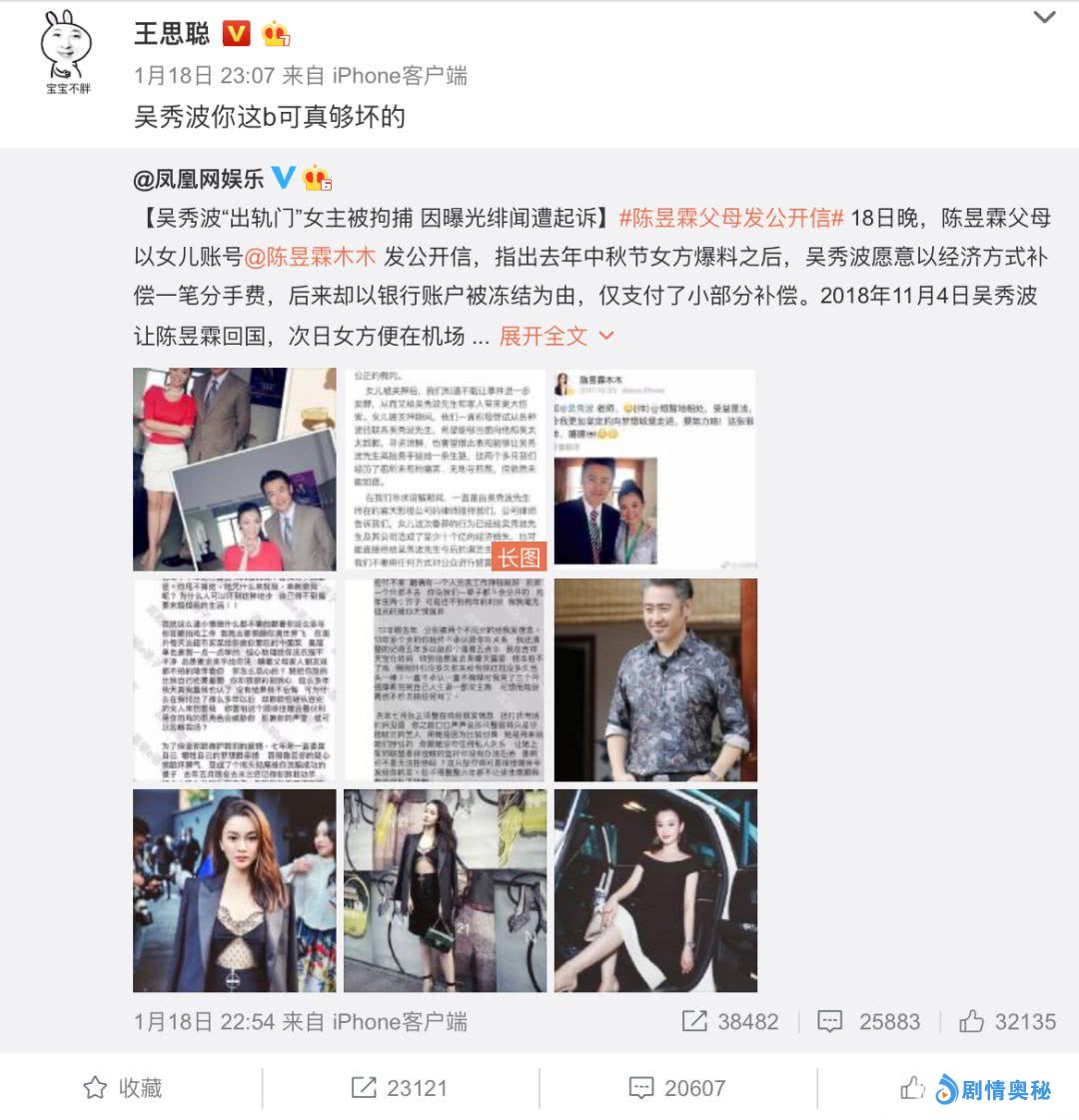 1月18日晚,陈昱霖父母发布公开信,称女儿被吴秀波诱回国内,以涉嫌敲诈勒索罪被捕。此后,王思聪打头,黄毅清随后,全民diss吴秀波。