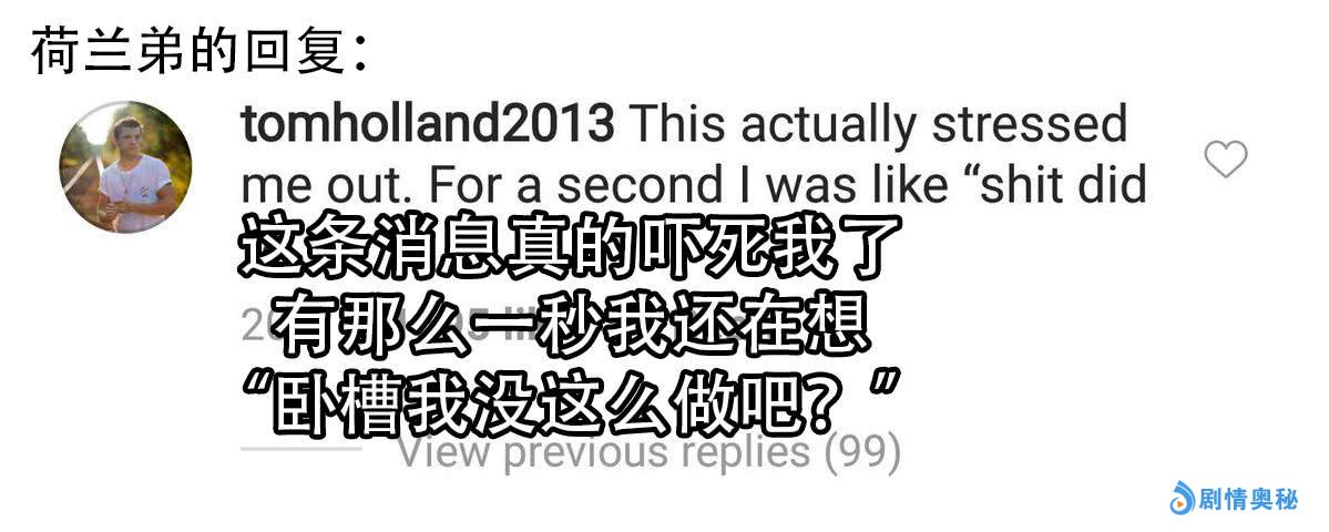 这条消息很快得到荷兰弟本尊的回应“这条消息真的吓死我了,有那么一秒我还在想‘卧草,我没这么做吧?’”这个粉丝的恶搞很有水平,荷兰弟怕是看到这条消息心都凉半截,就怕漫威狙击手已经瞄准了自己!不过仔细想一下,不对,我根本就没看过剧本,哈哈。