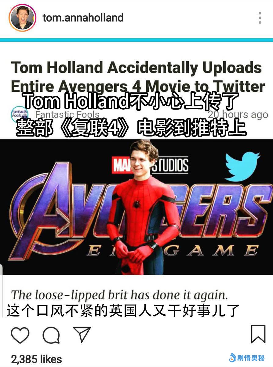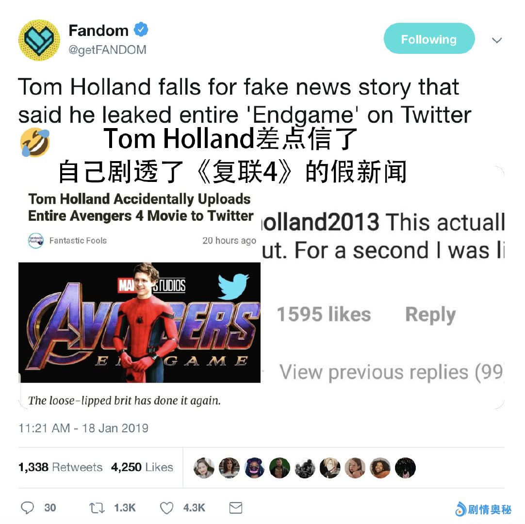 《复联4》还有三个多月上映,最近也在宣传期,这回荷兰弟没有剧透,不过喜欢他的粉丝恶搞了一把荷兰弟“剧透”,一位网友说“荷兰弟不小心上传了整部《复联4》电影到推特上,这个口风不严的英国人又干好事了。”配图还用了《复联4》的标题背景和和荷兰弟头像,搞得很像大新闻的样子。