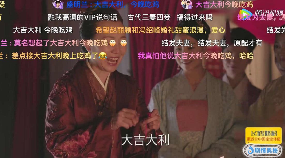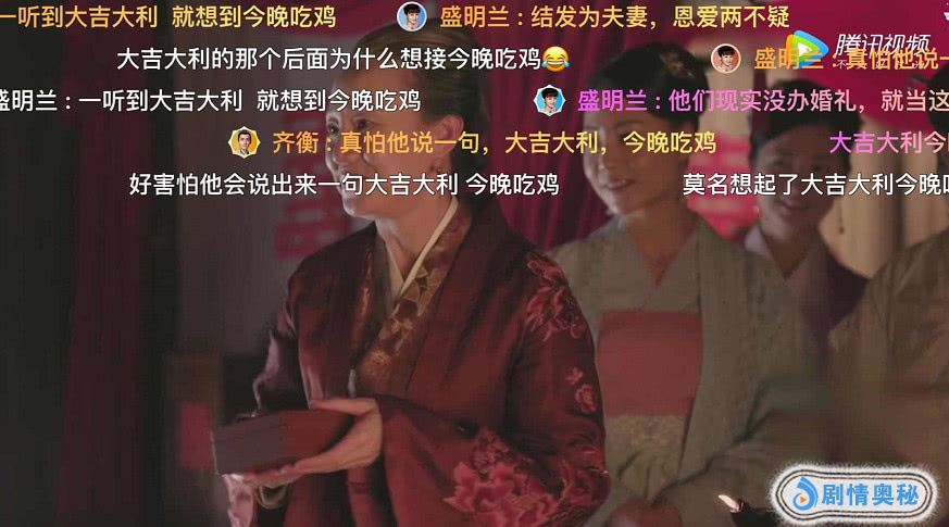 喜娘也是恭喜道“大吉大利”,在整部剧中这句话其实是给两位新人一个美好的寓意,只是没有想到这句话就被网友玩坏了,相信很多开弹幕的网友都能发现,弹幕中清一色飘过了“今晚吃鸡”,这句台词确实也让大家想入非非,甚至让他开口的时候,很怕他会突然来这么一句,所以如果要好好看这部剧的话,千万不要开弹幕,不然随时可能会笑抽过去