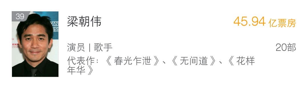 梁朝伟出道这么多年,风靡华语影坛的作品绝不仅《捉妖记2》一部,前两年主演的《摆渡人》同样狂揽近5亿票房,个人累计票房已经高达45.9亿,难怪有网友表示:梁朝伟是真正的票房巨星!
