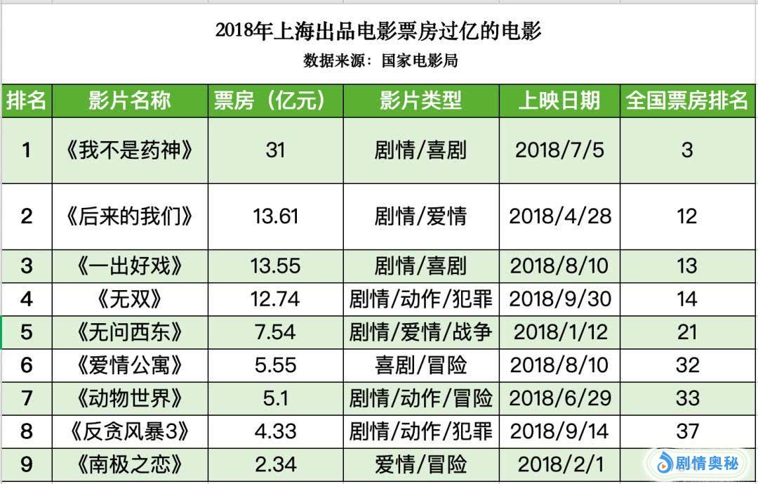 在下半年的暑期及国庆两个重要档期,上海出品影片表现突出,市场成绩分别占全国总票房的三分之一,全国地位和影响力显著提升。其中,花满山影业的《我不是药神》以真实事件为背景,在类型片的叙事框架下探讨深度社会问题,引起了全社会的广泛关注,并得到《人民日报》等主流媒体的推荐和肯定,累计超过30亿的票房位列全国国产片票房前三,同时也创造了上海出品单片破30亿的票房纪录。上海博纳的《无双》作为一部高智商犯罪类型片,则充分重现经典港味,一路领跑2018年国庆档,收获12亿票房。