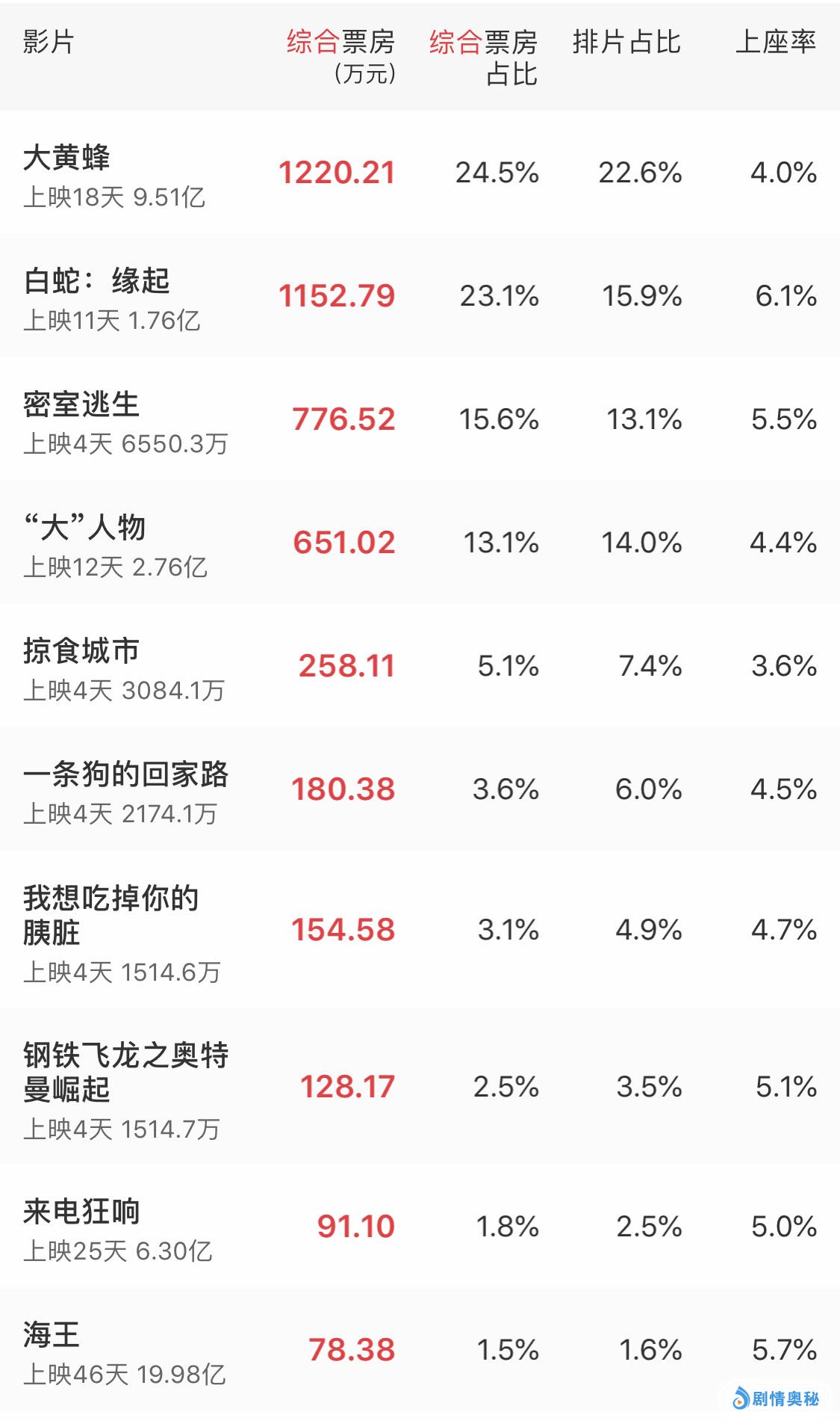 已经上映了18天之久的好莱坞特效大片《大黄蜂》一直长期霸占着单日票房排行榜的冠军,而上映了11天之久的《白蛇:缘起》则占据了单日票房排行榜的第二位,这2部上映有一段时间的电影占据票房榜的前2位,恰恰说明了新上映的几部电影的票房竞争力不足。