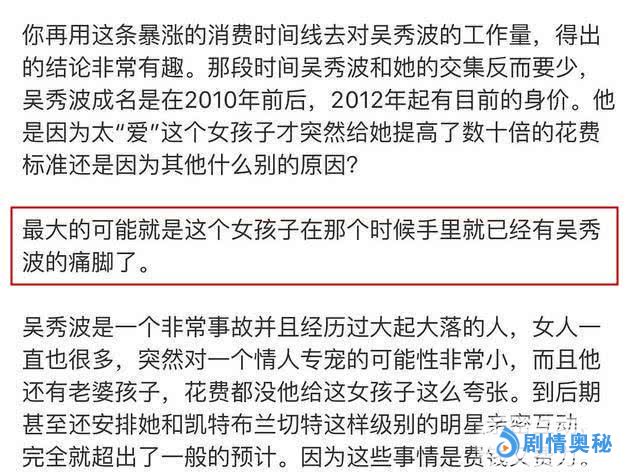 而且她还否认了女孩勒索吴秀波的事。她说这些事本来就是吴秀波曾经承诺过的。还说吴秀波平时对她的管束也非常严,无论是去哪儿见谁,都要让他知道。而且还说陈昱霖之所以心情抑郁,跟吴秀波也是有关系的。