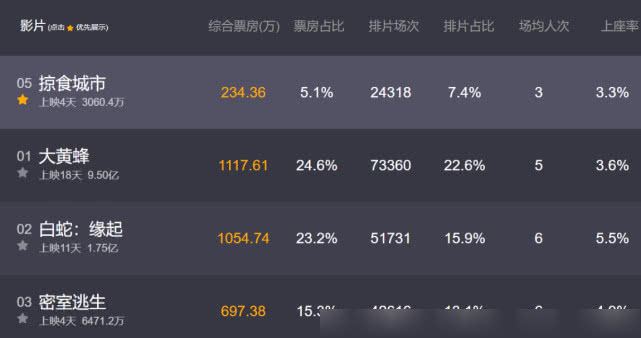 而国漫《白蛇:缘起》在口碑的带动下,终于逆袭到了单日票房第二,截至21号17点电影累计票房为1.75亿,不过报道称该片投资在9000万左右,恐怕回本还是有些压力的,目前在排片只有15.9%的情况下,上座率超过了《大黄蜂》,单日票房拿下了1054万,极有可能在晚上或者明天将逆袭拿下日票房冠军