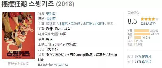 韩国观众给《摇摆狂潮》打出了9分,而在豆瓣平台,这部冷门佳作口碑也极佳,高达8.3分。