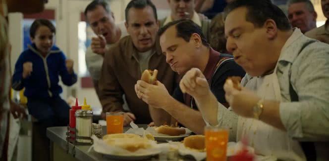 跟人比赛吃热狗,一顿能塞26 个,每个都带佐料和蘸酱。