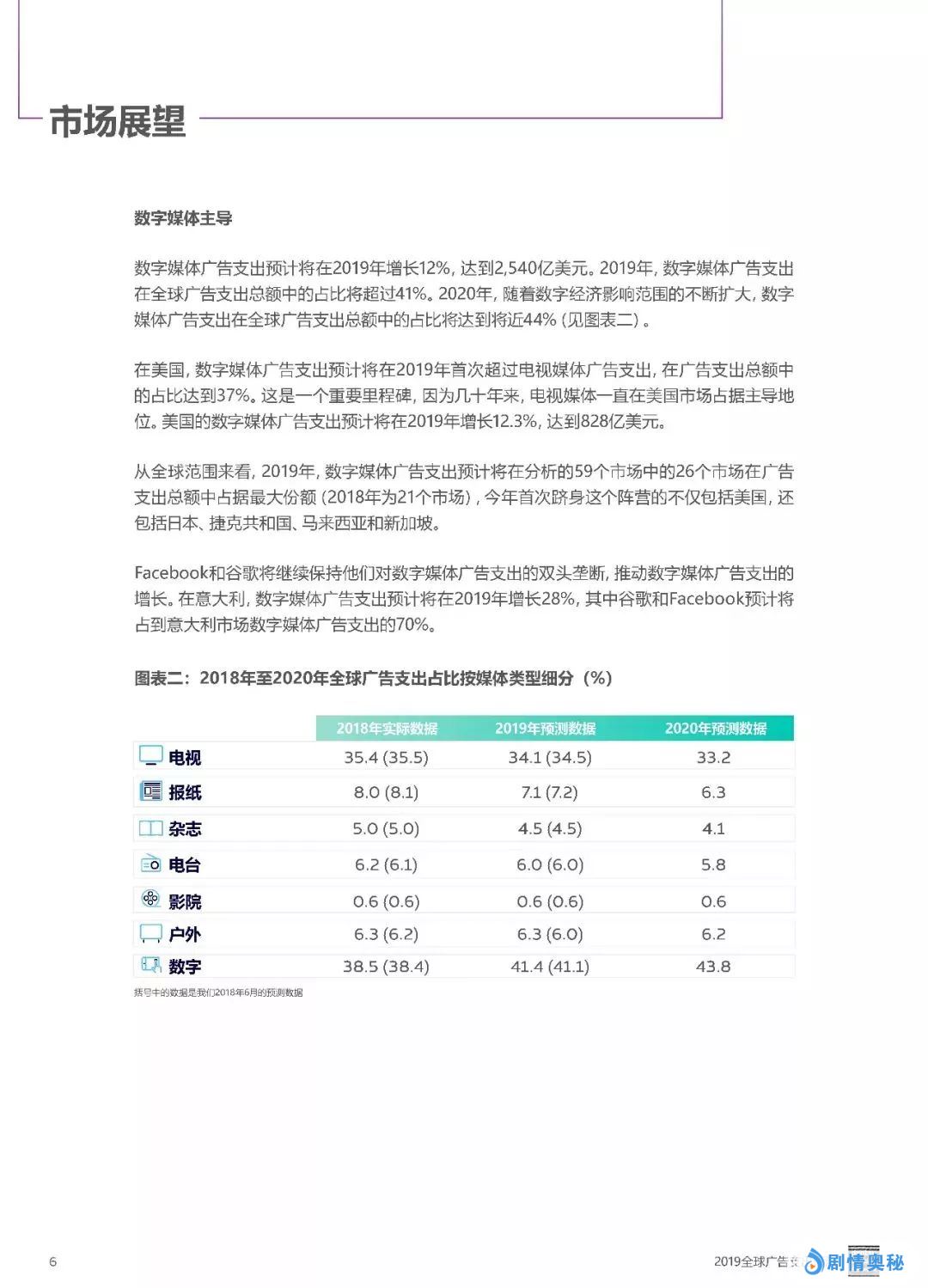 2019年,数字媒体广告支出预计将增长12.0%,达到2,540亿美元,在全球广告支出总额中的占比达到41%。数字媒体将是分析的59个市场中的26个市场最主要的广告支出渠道,其中美国、日本、捷克共和国、马来西亚和新加坡将首次跻身这一阵营。