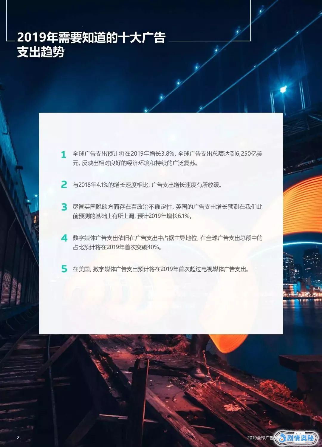 电通安吉斯集团14日发布最新广告支出预测报告,根据来自59个市场的数据显示,全球广告支出增幅将从2018年4.1%的基础上,2019年预计增长3.8%,全球广告支出总额达到6,250亿美元。