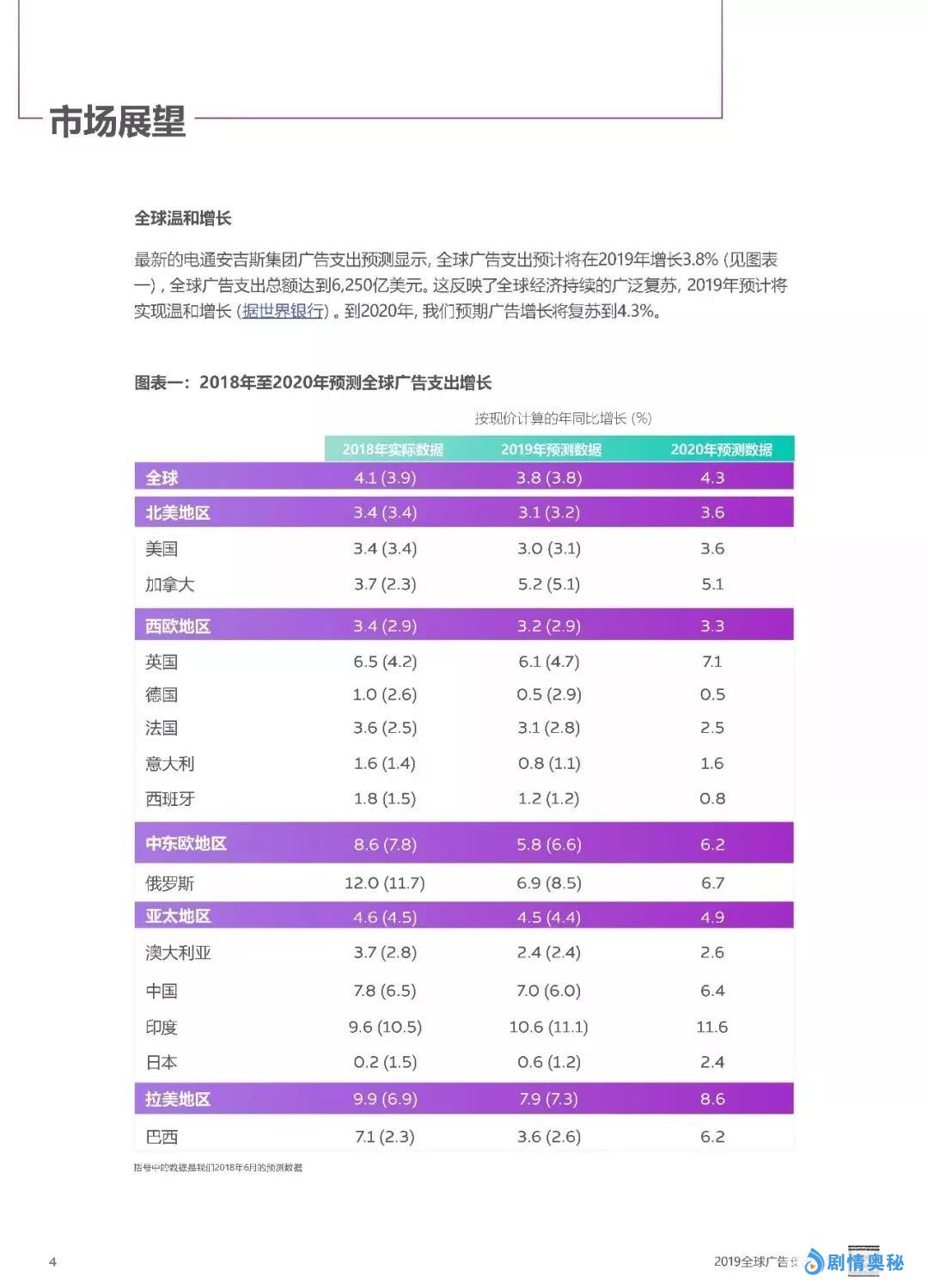 亚太地区和北美地区预计将分别为全球广告支出增长贡献42%和30%。西欧地区预计将增长15%。拉美地区预计将增长10%。中东欧地区预计将增长4%。