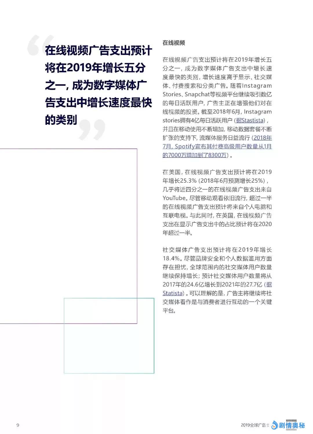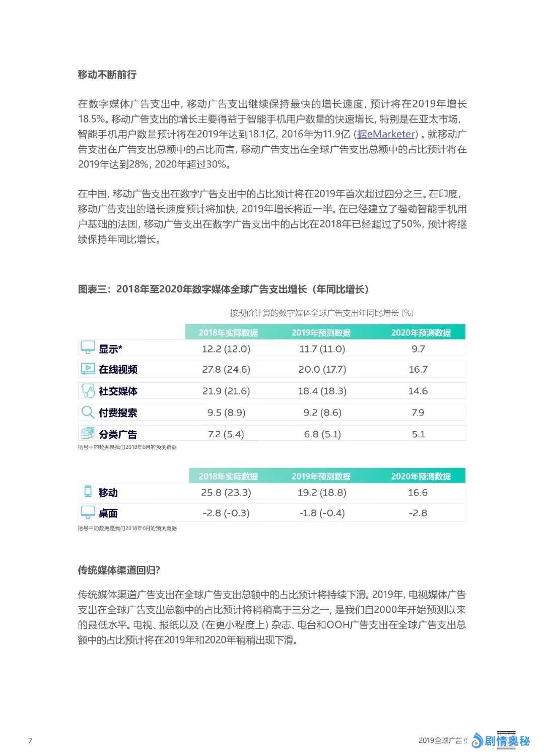 移动广告支出预计将继续保持强劲增长(增长19.2%),其中视频广告支出增长尤为强劲(增长20.0%)。2019年,尽管出现了品牌安全和隐私方面的担忧,社交媒体广告支出增长预计将继续保持强劲(增长18.4%)。