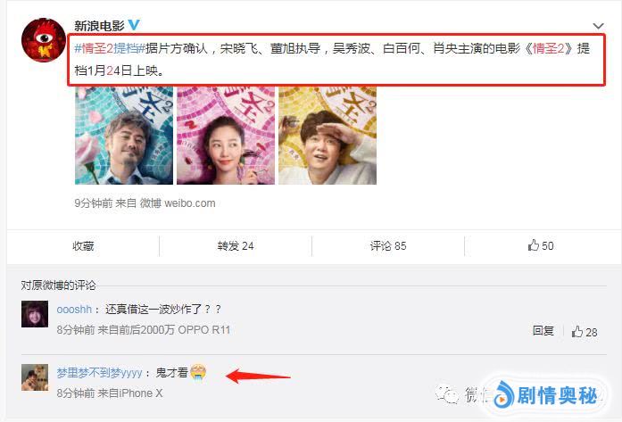 伴随着海报的发布,一时间又引起了众多吃瓜群众的关注和质疑。该片是否蹭着吴秀波事件的热度来吸引眼球,或者是担心受吴秀波事件的影响,该片无法在贺岁档上映,从而想出了提档于1月24日的想法。不过,纵观网友产生了质疑以及不解,影片提档消息已经得到了新浪电影的证实。