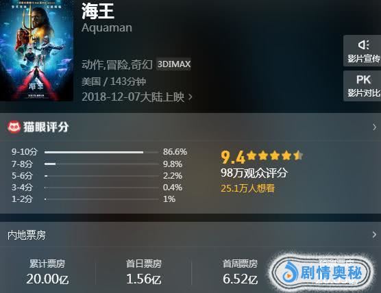 而接下来,《海王》更是势如破竹,碾压多部华语大片,无论是口碑神片《无名之辈》、还是群星大片《天气预爆》、《武林怪兽》等等,在《海王》的面对都毫无还手之力,完全不是一个量级的对手。