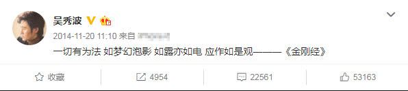 陈昱霖在和吴秀波摊牌之前,也在微博中发了两句《金刚经》中的话,分别是“凡所有相,皆是虚妄;若见诸相非相,即见如来”和“如来者,无所从来,亦无所去,故名如来”。这两句佛偈是何深意,相信每个人都有自己的看法。