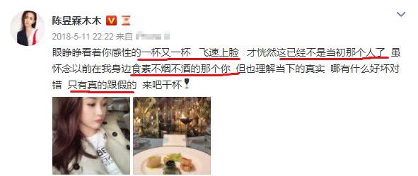 2018年5月11日深夜,陈昱霖发了一条和人吃饭的微博,这个描述的对象或许可能就是吴秀波。或许吴秀波曾经真的可能不烟不酒,但是现在这“一杯又一杯”,确实让人感觉人都会变的,只可惜陈昱霖明白这个道理太晚。