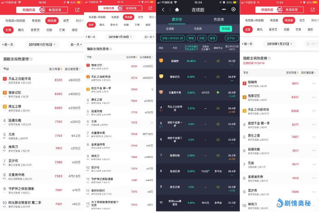 2019开年,爱奇艺多部网剧表现强劲,根据猫眼、云合数据等多家数据平台网络剧榜单显示:包括《独家记忆》《皓镧传》《原生之罪》《时光教会我爱你》《神风刀》《守护神之保险调查》《延禧攻略》《芸汐传》等网剧包揽多个榜单。其中,云合数据网络剧霸屏榜TOP10有7部均由爱奇艺独播;猫眼专业版网剧热度榜TOP10中更有多达9部来自爱奇艺,TOP5均由爱奇艺高品质内容包揽。