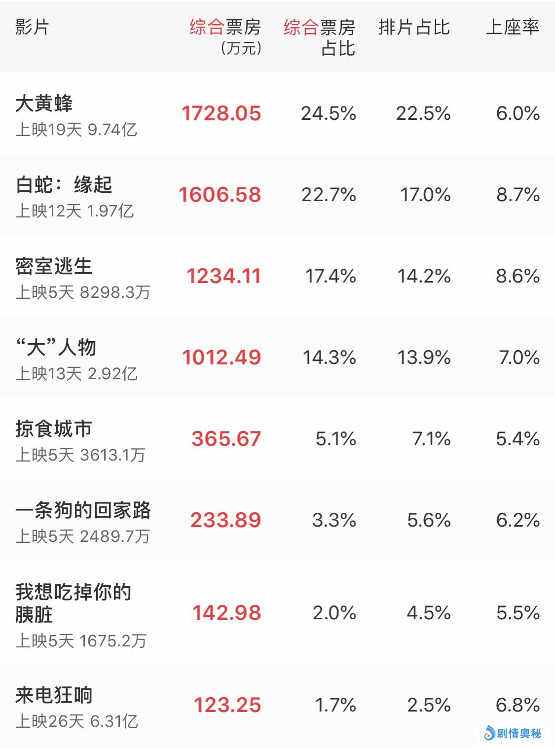 从票房成绩上来看,上映19天之久的《大黄蜂》继续领跑单日票房榜,已经连续19天拿下单日票房冠军,目前总票房突破9.7亿。国产喜剧片《“大”人物》的票房成绩不错,上映13天总票房成绩2.9亿,国产动画片《白蛇:缘起》上映12天1.9亿。另外新片《密室逃生》上映5天票房8200万,有一点“黑马”的味道。
