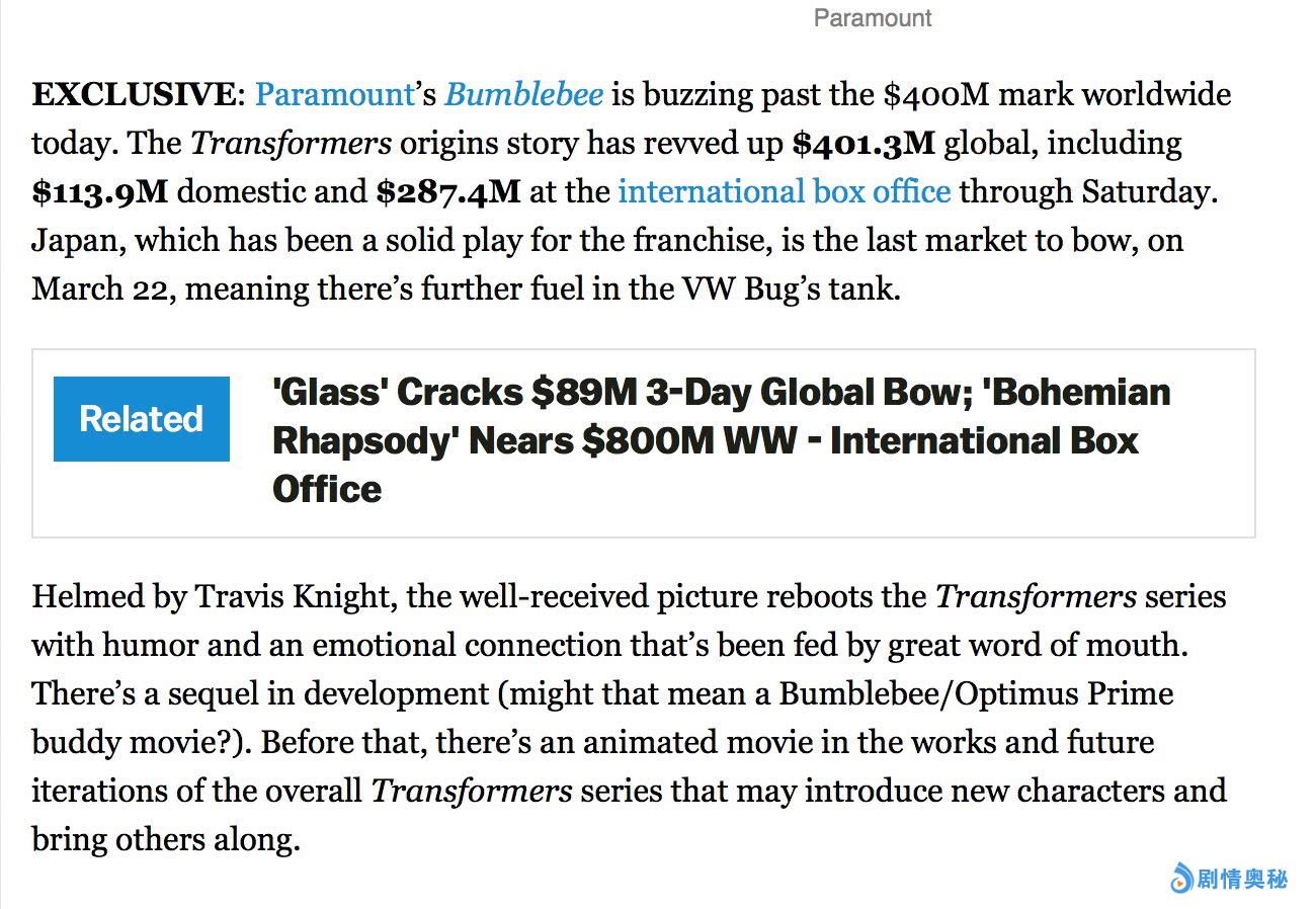 据外媒报道,这个数据令派拉蒙非常满意,因为上一部变形金刚系列电影《变形金刚:最后的骑士》让派拉蒙亏损了至少一亿美元。《大黄蜂》成本为1.32-1.35亿美元左右,已经让片方盈利了,加上极佳的影评人和观众口碑,似乎给了这个系列新的希望。