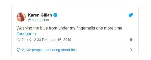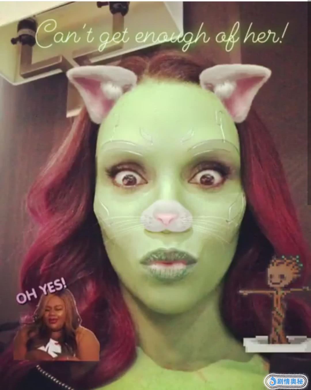 “鹰眼”杰瑞米·雷纳晒图,爆料自己又补拍了复联4;“卡魔拉”佐伊·索尔达娜晒出化妆视频,一身绿色颜料,补拍复联4;“星云”凯伦·吉兰发文,称自己“在清洗蓝色的指甲油”,暗示补拍复联4。