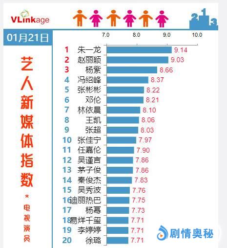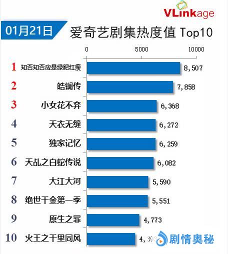 爱奇艺现在不显示播放量,只显示热度值,排在第一的是《知否知否应是绿肥红瘦》热度8507,第二名《皓镧传》热度7858,从榜单上来看,这个成绩还是很不错的,吴谨言也因为这部剧进入了电视剧演员艺人新媒体指数排行榜的前20名。