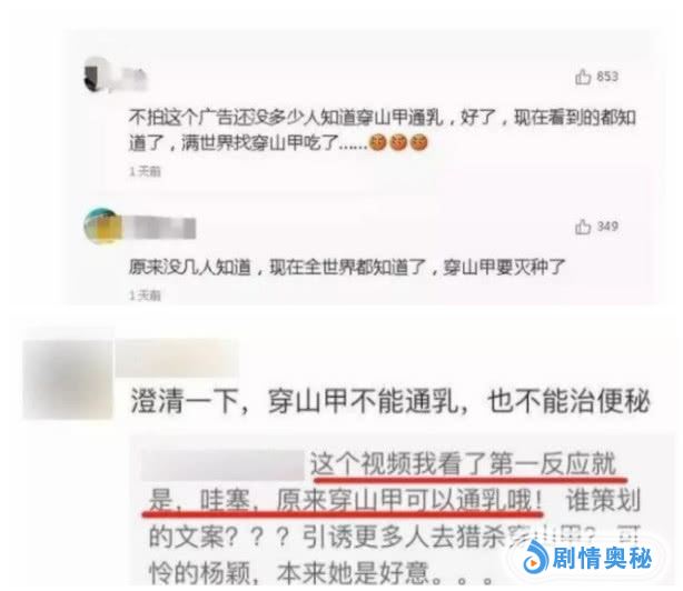 网上的评论称:本来没多少人知道穿山甲通乳,现在好了,看了杨颖宣传片后都知道了
