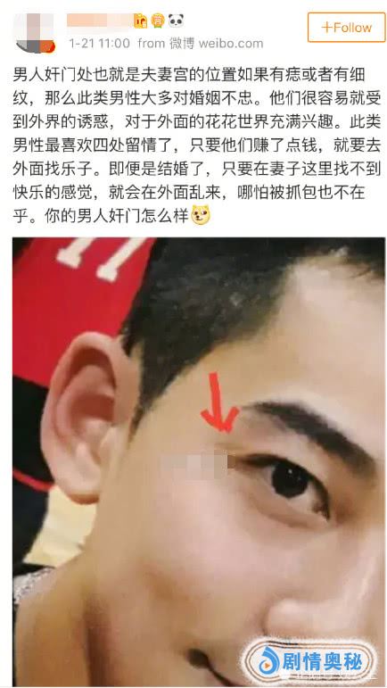 还以为这是怎么了,点进照片中才明白,原来是一个算命的博主,为了“揽客”,让自己更火,拿苏醒的照片来进行了一番讲解,说“男人的奸门有痣或者有细纹,是经挡不住外面的诱惑,容易四处留情的”,最后还说“在外面乱来哪怕被抓包也不会在乎,你男人的奸门怎么样”。还特意在苏醒的眼皮上画上了一个箭头。要说这个博主也真是胆小鬼,都知道他说的就是吴秀波,但却不敢放吴秀波的照片,怎么着?你也怕吴秀波给你送监狱去??