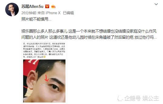 苏醒发了一条微博称“照片能不能慎用,娱乐圈那么多人那么多事儿,这是一个本来就不想结婚也没结婚没家庭没什么作风问题的人的照片,这道纹还是他幼儿园时候在床脚磕破了然后留了疤,放过他行么”。