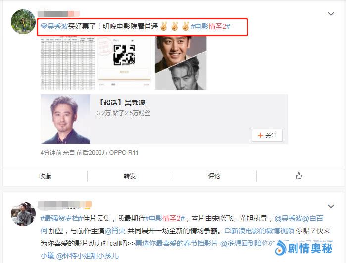 除了吴秀波、白百何实力加盟,肖央、乔杉、克拉拉等人近年来在影视作品中的表现大家也是有目共睹,虽然吴秀波事件一度持续发酵,但是相信影迷始终不会被吴秀波事件影响到观影的心情。而且本次提档,更是令不少影迷表示期待。甚至还有网友在微博上晒出了已经提前购买好电影票了,准备周四晚在电影院看肖遥(吴秀波饰)。