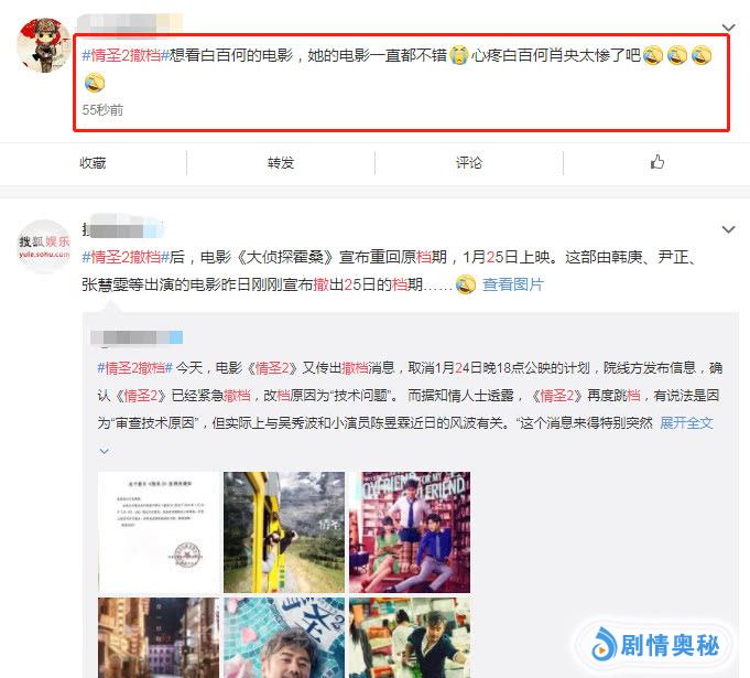 甚至随着该事件的持续发酵,原本撤出贺岁档定档1月24日的影片《情圣2》再次宣布撤档,具体上映时间影片片方为做出反映,而是发布了一张海报:感恩同行,来日再见!而影片撤档后,除了引起一度热议之外,还有部分网友对于影片中白百何和肖央等人表示心疼。