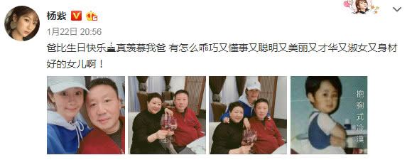 1月22日晚,杨紫在微博更新了一则动态。“爸比生日快乐,真羡慕我爸 有怎么乖巧又懂事又聪明又美丽又才华又淑女又身材好的女儿啊!”