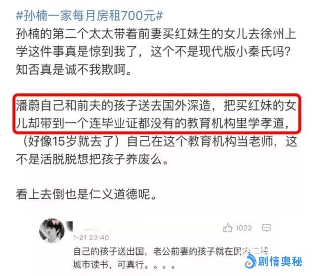值得一提的是,送去读国学的包括孙楠与前妻买红妹的孩子,而潘蔚和前夫所生的女儿读完高中就考托福出国了。简而言之就是,前妻的女儿去读“女德”,亲生女儿送出国。