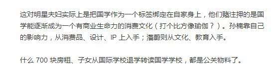 该网友认为:孙楠夫妇是“把国学作为一个标签绑定在自家身上”,因为他们相信“国学能逐渐成为一个有商业生命力的消费文化”。而前一天的“700块房租”、“送孩子上国学学校”其实都是他们的宣传物料。