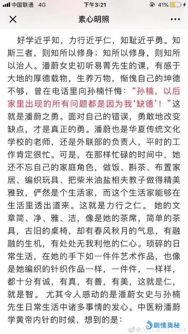 这听着相当功利了,然而潘蔚在其新书《素心映照》宣传期间曾在公众号上发布过一篇通稿,写到自己在华夏学宫听课之后,惭愧自己的“坤德不够”并向孙楠忏悔:“孙楠,以后家里出现所有问题都是因为我缺德。”表示以后要好好相夫教子……