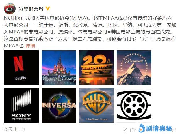 1月23日,Netflix正式加入美国电影协会(MPAA)。此前MPAA成员仅有传统的好莱坞六大电影公司——迪士尼、福斯、派拉蒙、索尼和华纳,网飞是第一家加入MPAA的非电影公司、第一家加入MPAA的流媒体。传统电影公司=美国电影主流的局面在改变。