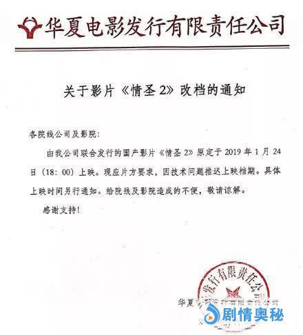 这部原定于大年初一(2月5日)上映的电影曾提档至1月24日,此次已是二度改档。发行方表示因技术问题,上映日期另行通知。