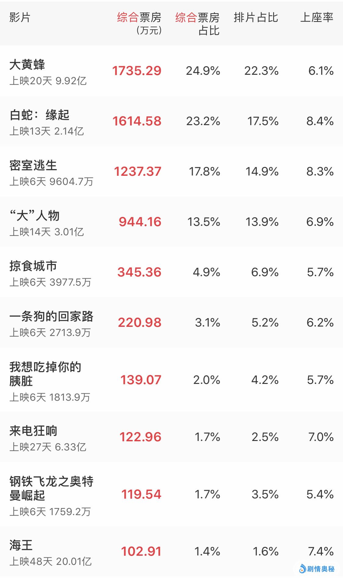国产电影方面,动画电影《白蛇:缘起》应该算是一匹票房“黑马”了,上映13天总票房突破2.1亿,对于一部前期没有什么宣传的动画片来说,这样的票房成绩是相当的优秀了。