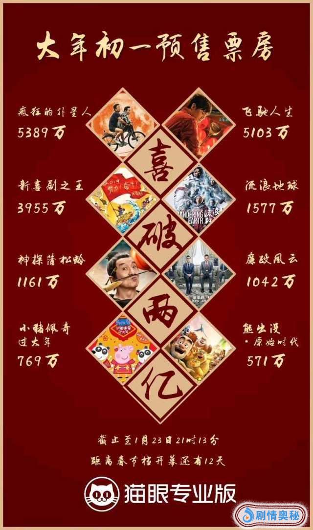根据猫眼专业版数据显示,截止至1月23日21点13分,距离春节档开幕还有12天,大年初一电影预售总票房已经突破2亿元人民币。