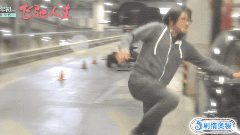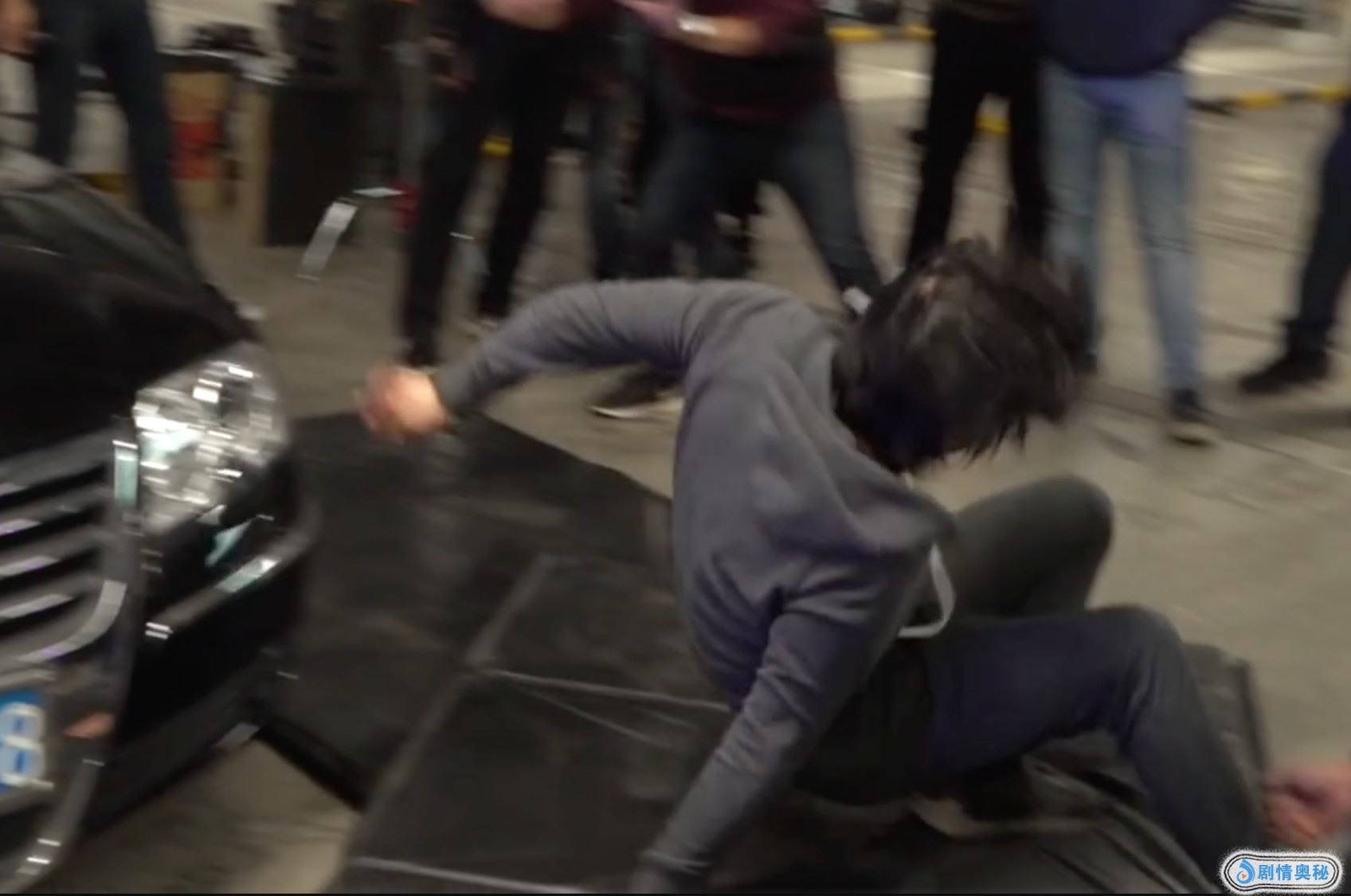 韩寒甚至还大胆挑战危险的特技动作,助跑后从车上跨过,谁料一不小心摔倒,幸好地上有保护的垫子,韩寒被工作人员扶起,大叫“我的屁股”。