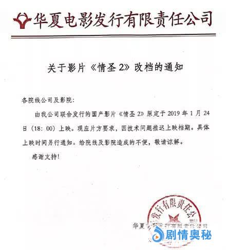 《情圣2》因不可控的因素,原本提档至1月24日18:00上映,突发性撤档,发行方华夏电影发声明,“因技术问题”。