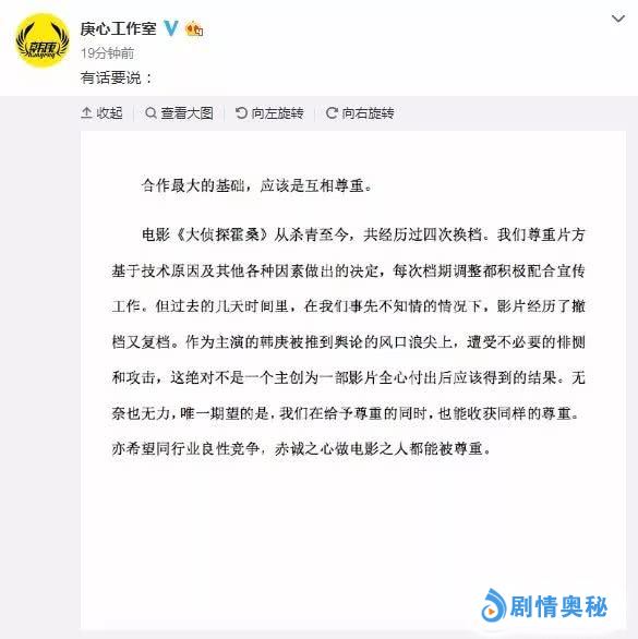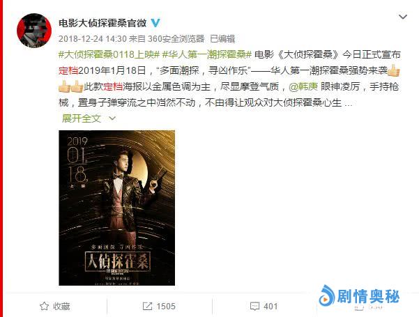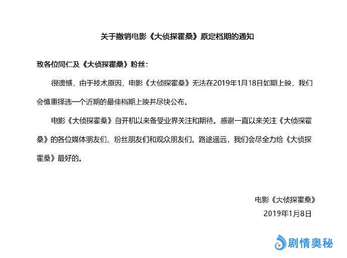 2018年12月24日,《大侦探霍桑》再一次官宣,影片定档2019年1月18日。