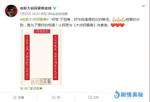 当晚,电影官博正式宣布,“短暂的分别,是为了更好的相遇”。