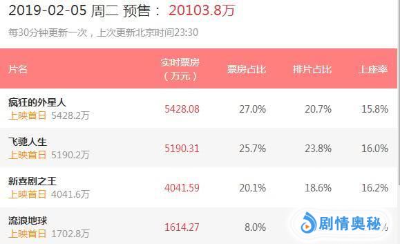 这四部影片堪称2019春节档终极种子选手,其中每一部都有冲击票房冠军的实力,尤其是《流浪地球》,虽然目前仅第四,但爆发潜力巨大,一旦口碑爆炸,票房或许会再现《战狼2》的神话,成为终极黑马!