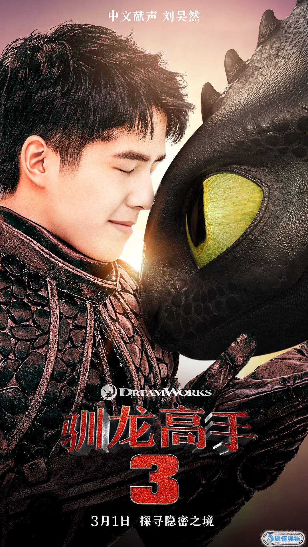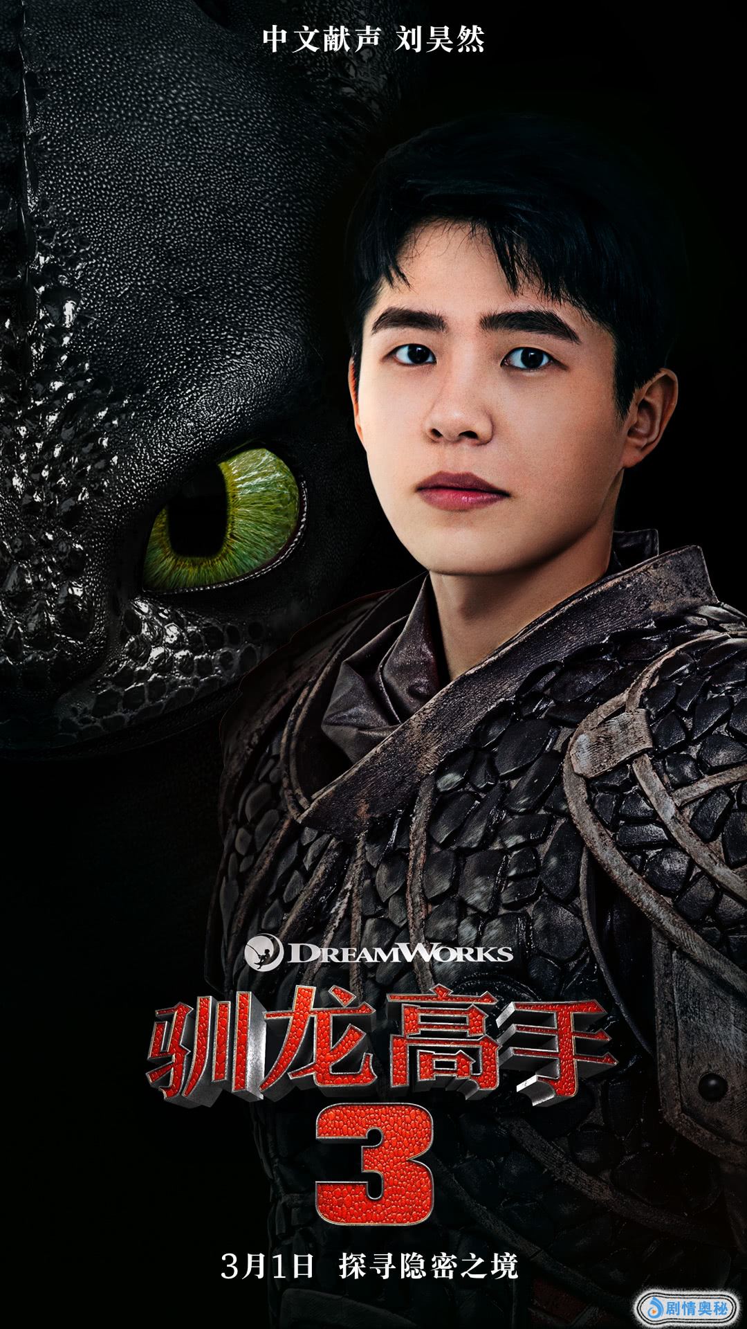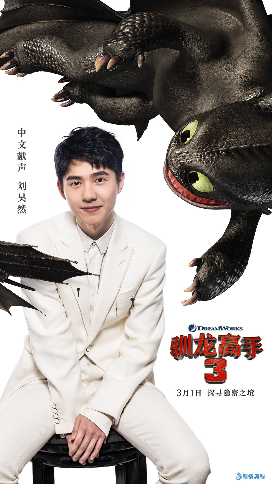 《驯龙高手3》是刘昊然献声的首部动画电影,他因《唐人街探案》系列以及陈凯歌作品《妖猫传》 等多部大银幕作品确立了新生代男演员领军人物地位,环球影业中国市场部高级副总裁黄美仪认为,刘昊然是演绎嗝嗝的最合适人选。