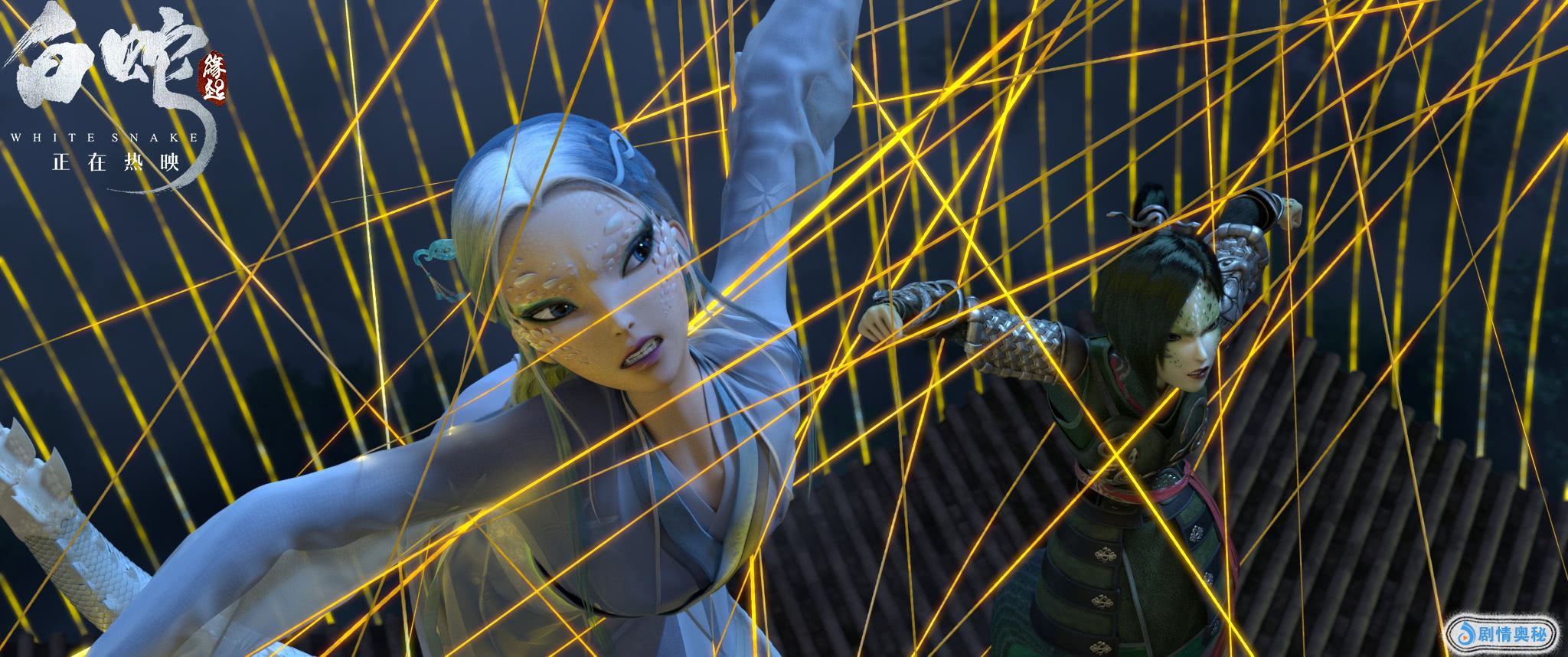 本次发布的动作片段中,半妖化的小白和小青姐妹两人合力对抗电影中的年轻道士,充分表现出了两人的默契配合。小道士那边也不甘示弱,他控制的金色飞针十分凌厉,不停向姐妹两人发起攻击,让人一刻也无法将目光移开。