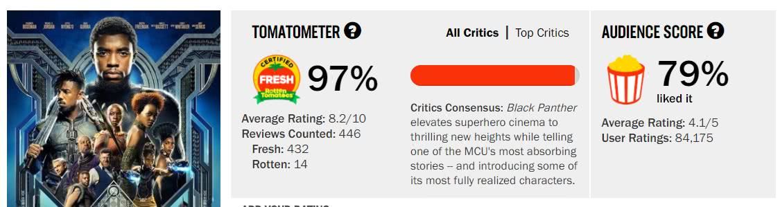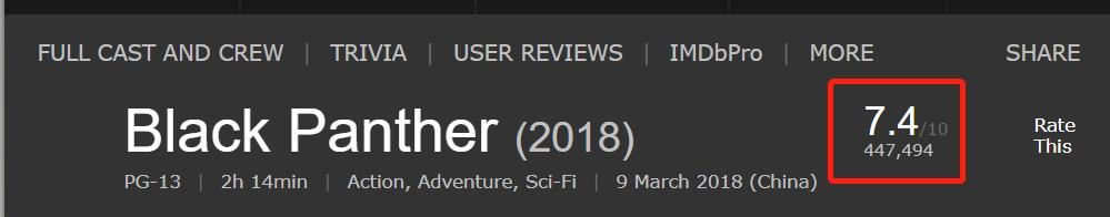 起码imdb7.4的评分,烂番茄97%的新鲜度也说明了《黑豹》是一部合格的爆米花电影。