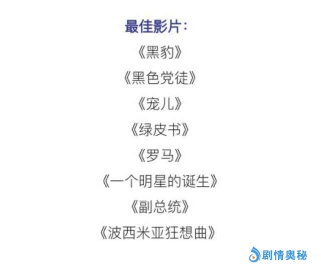 而今年入围奥斯卡金像奖“最佳影片”的电影分别是《黑豹》、《黑色党徒》、《宠儿》、《绿皮书》、《罗马》、《一个明星的诞生》、《副总统》、《波西米亚狂想曲》。