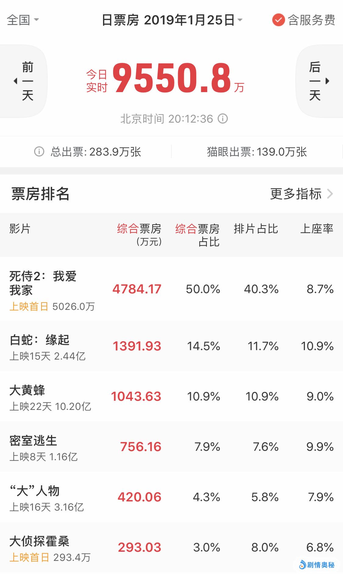 值得一提的是,除了《死侍2》的单日票房成绩突破5000万之外,其余同期上映的电影的单日票房成绩都不算太高,只有《白蛇:缘起》和《大黄蜂》的单日票房能够突破1000万。《白蛇:缘起》、《大侦探霍桑》、《“大”人物》等几部国产片的单日票房加起来都没有一部《死侍2》。