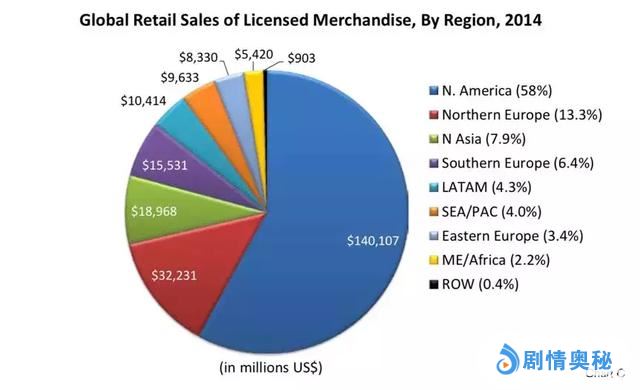 而根据LIMA(国际授权业协会)2015年公布的全球衍生品研究报告称:北美为全球最大的衍生品市场,占比高达 58%,市场总值为 1401 亿美元。而整个亚洲只有7.9%,为180亿美元。对比票房收入,中国市场仍处于发展初期,这是整个行业的蓝海,但也是机遇。