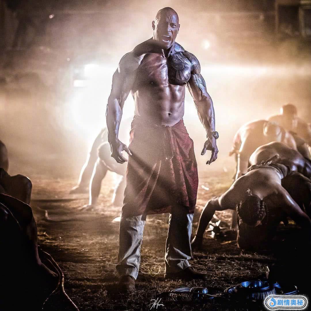 剧照中,强森的穿着打扮十分抢眼,上面光着膀子秀肌肉,下面却裹得严严实实,除了一件裤子之外,还绑着一条红裙。此外,强森周围的地上还爬满了壮汉,似乎是在臣服,不知道电影中到底发生了什么事情。