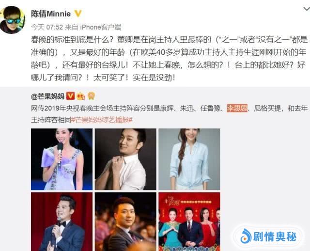 有一个人的发声,倒是引起了大家的注意。她就是倪萍老师的助理。陈倩说,她搞不懂主持人里没有董卿的原因。因为显然无论是董卿的能力还是她的年龄,还是她的好人缘。不能说是最好的吧,也基本可以说是最优秀的。而且直言不清楚春晚的标准到底是什么。还说这件事实在是太可笑了。这非常霸气的开怼也是很敢说了。毕竟往年主持人是谁,如何定的。普通观众只能是看个热闹。基本上观众可以发言,但是并不能左右主持人的人选。